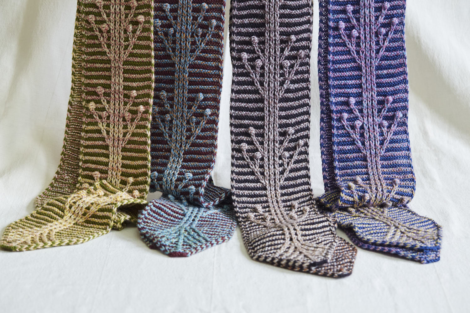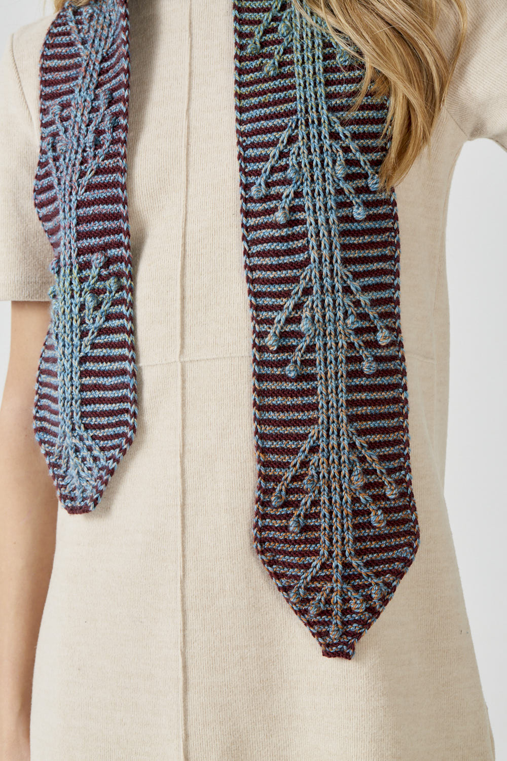 Ulukayn – originally Ulukayın, in Turkish mythology is the tree of life at the very center of the earth. Reimagined in a skinny scarf, on a 2-color Garter base, constructed with slip stitches, and Estonian Nupps.